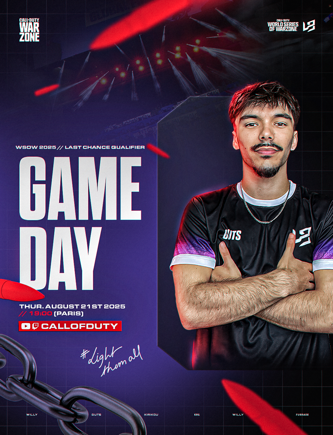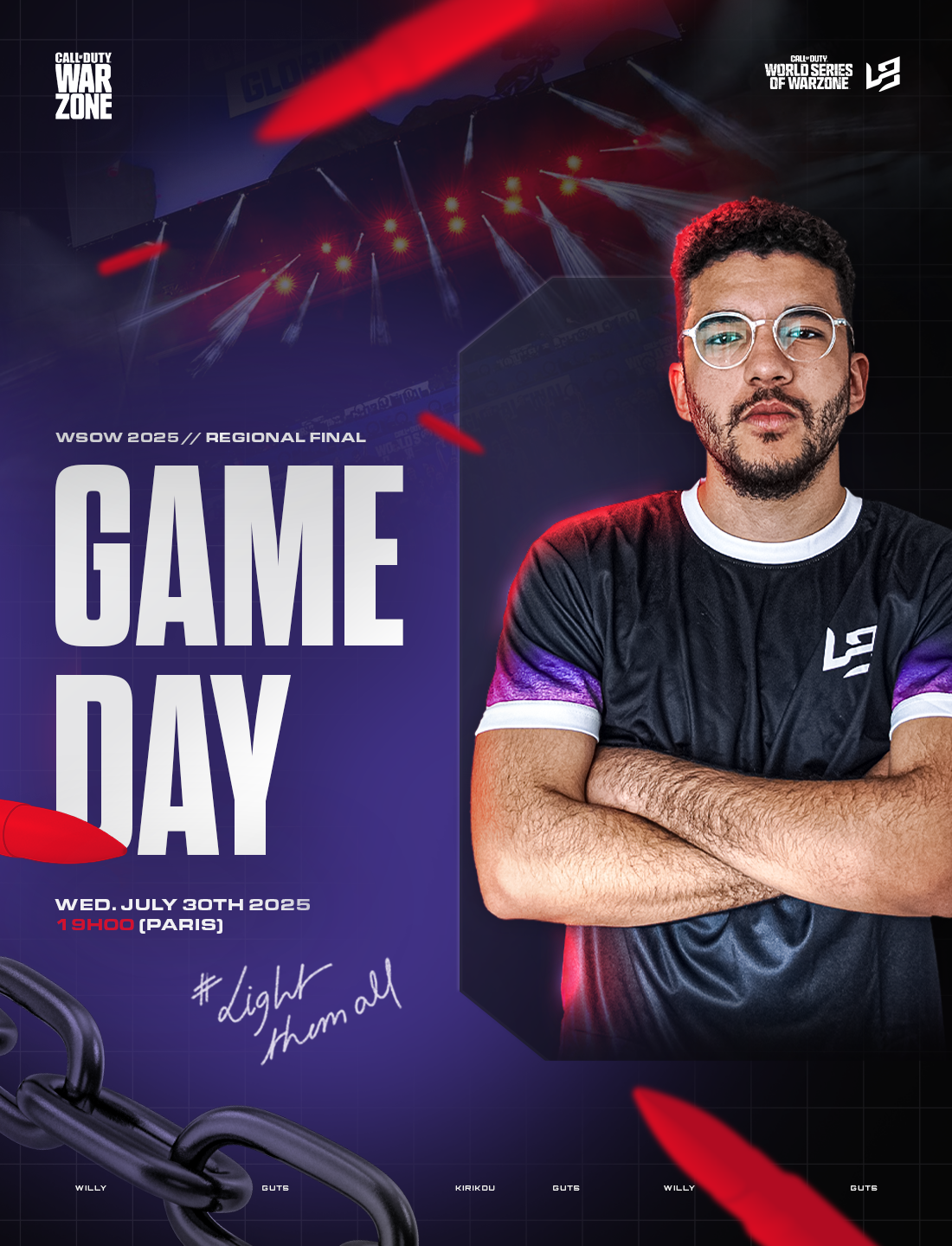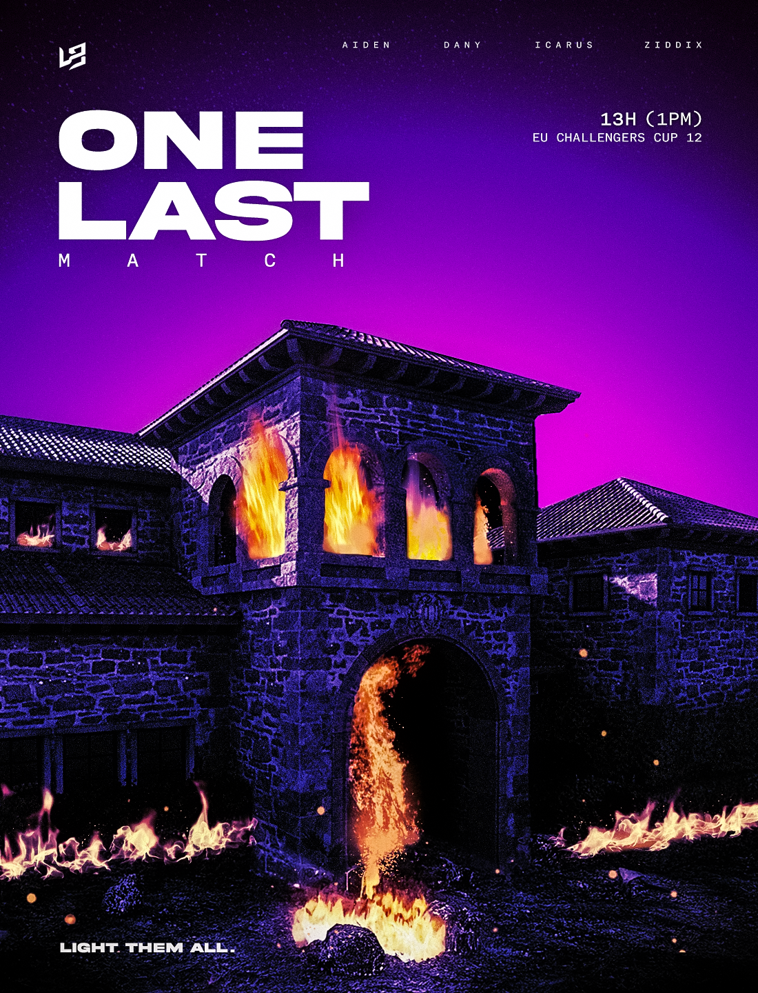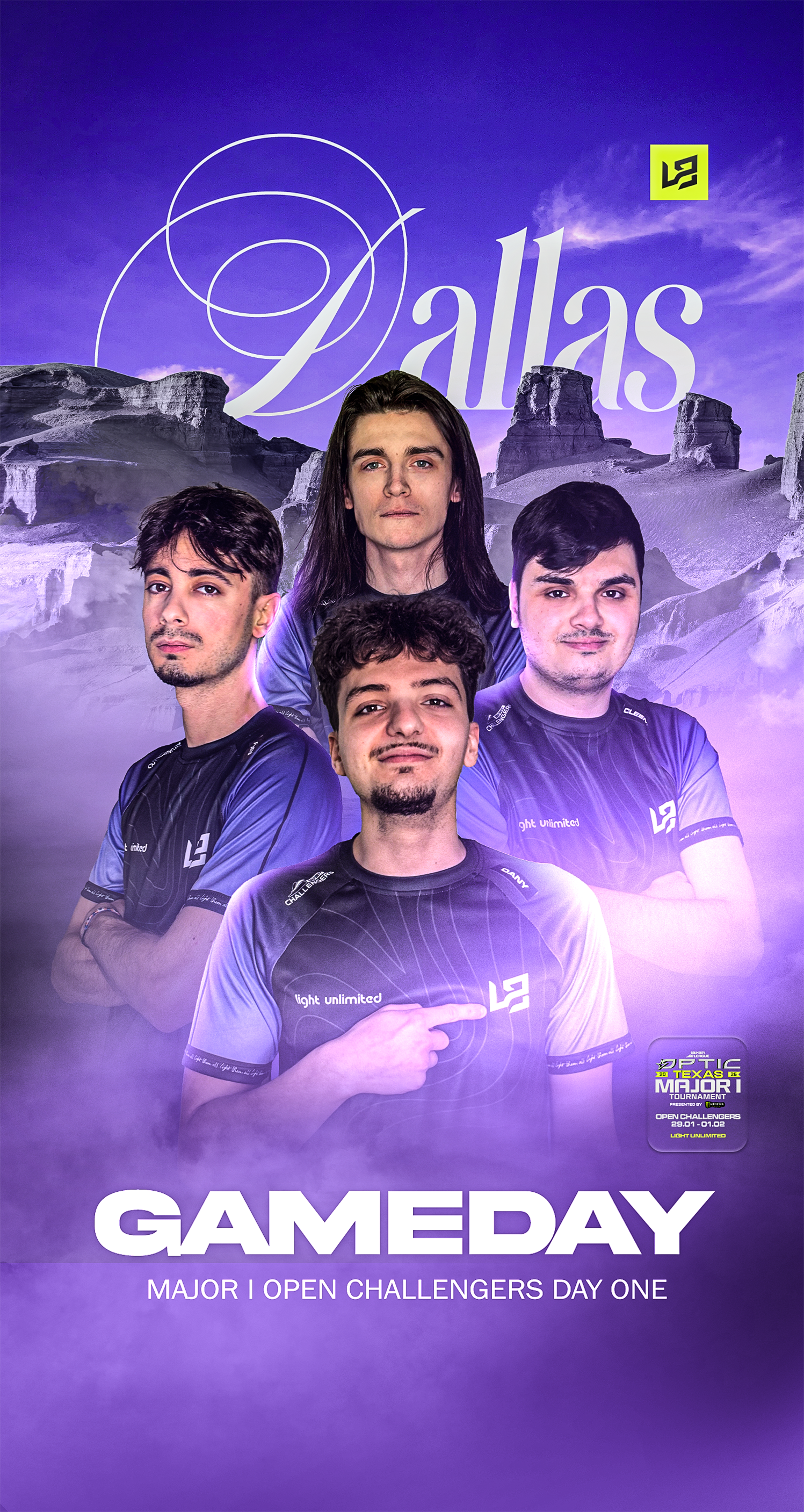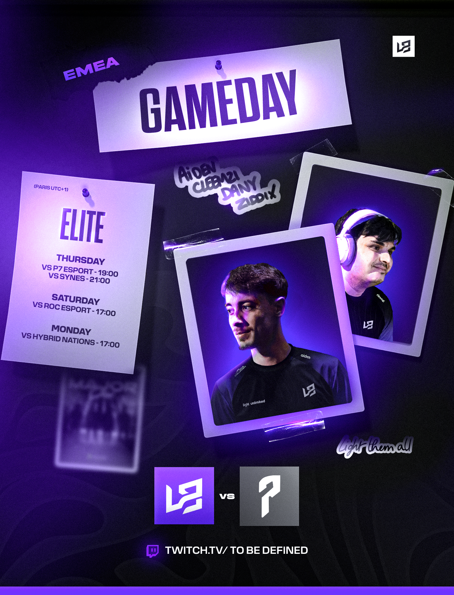 LIGHT UNLIMITED est une structure e-sport compétitive que j'ai créée fin 2024. Il s'agit du projet qui me tient le plus à coeur, car c'est celui sur lequel j'ai le plus développé mes compétences en graphisme. En effet, gérer une équipe e-sportive implique de se créer une identité visuelle et de communiquer sur les réseaux via de nombreux visuels (gameday, bannières etc.).